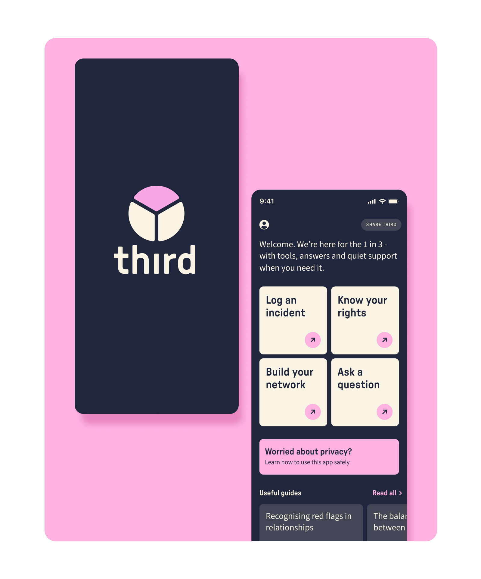 Third is a new app designed to give women fast, private access to safety, support and information - all in one place.It’s been entirely self-funded to date. The design is complete.