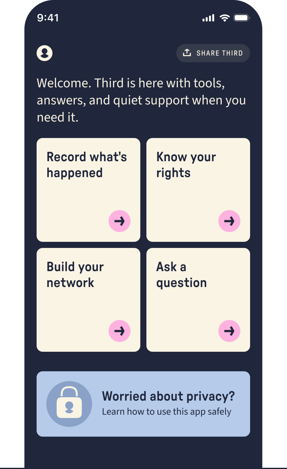 You can use an email address to log in to Third if you want to. If you’re concerned that your email is monitored or compromised, you can choose to use the app without relying on email.